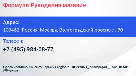 Формула Рукоделия, магазин по адресу 109462, Россия, Москва, Волгоградский проспект, 70 в дальнейшем Организация, размещена в следующих категориях: