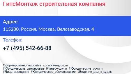ГипсМонтаж, строительная компания по адресу 115280, Россия, Москва, Велозаводская, 4 в дальнейшем Организация, размещена в следующих категориях: