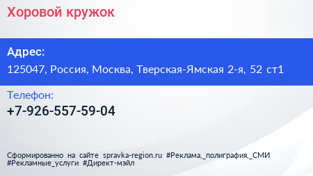 Хоровой кружок по адресу 125047, Россия, Москва, Тверская-Ямская 2-я, 52 ст1 в дальнейшем Организация, размещена в следующих категориях: