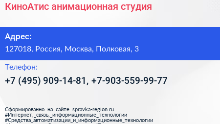 КиноАтис, анимационная студия по адресу 127018, Россия, Москва, Полковая, 3 в дальнейшем Организация, размещена в следующих категориях: