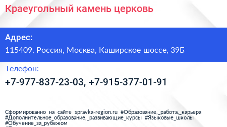 Краеугольный камень, церковь по адресу 115409, Россия, Москва, Каширское шоссе, 39Б в дальнейшем Организация, размещена в следующих категориях: