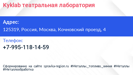 Kyklab, театральная лаборатория по адресу 125319, Россия, Москва, Кочновский проезд, 4 в дальнейшем Организация, размещена в следующих категориях: