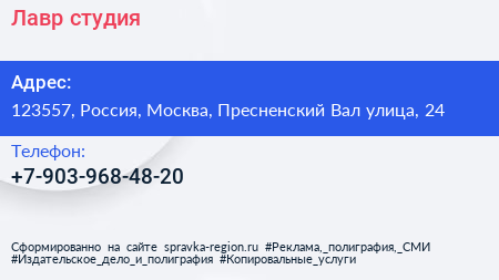 Лавр, студия по адресу 123557, Россия, Москва, Пресненский Вал улица, 24 в дальнейшем Организация, размещена в следующих категориях: