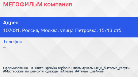 МЕГОФИЛЬМ, компания по адресу 107031, Россия, Москва, улица Петровка, 15/13 ст5 в дальнейшем Организация, размещена в следующих категориях: