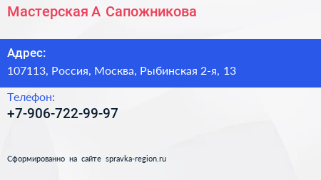 Мастерская А. Сапожникова по адресу 107113, Россия, Москва, Рыбинская 2-я, 13 в дальнейшем Организация, размещена в следующих категориях: