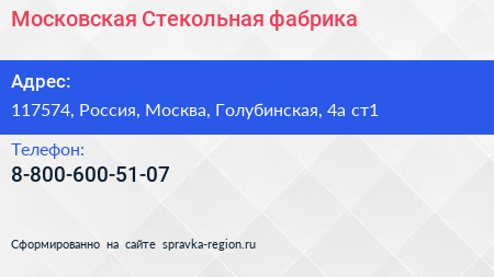 Московская Стекольная фабрика по адресу 117574, Россия, Москва, Голубинская, 4а ст1 в дальнейшем Организация, размещена в следующих категориях: