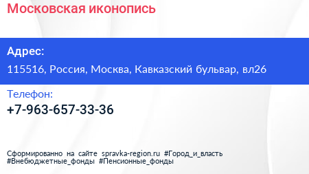 Московская иконопись по адресу 115516, Россия, Москва, Кавказский бульвар, вл26 в дальнейшем Организация, размещена в следующих категориях: