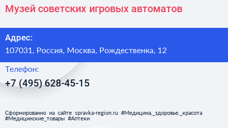 Музей советских игровых автоматов по адресу 107031, Россия, Москва, Рождественка, 12 в дальнейшем Организация, размещена в следующих категориях: