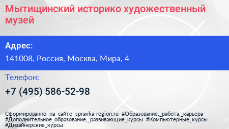 Мытищинский историко-художественный музей по адресу 141008, Россия, Москва, Мира, 4 в дальнейшем Организация, размещена в следующих категориях: