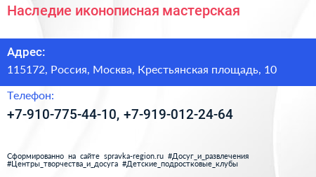 Наследие, иконописная мастерская по адресу 115172, Россия, Москва, Крестьянская площадь, 10 в дальнейшем Организация, размещена в следующих категориях: