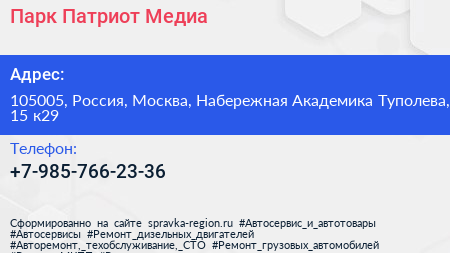Парк Патриот Медиа по адресу 105005, Россия, Москва, Набережная Академика Туполева, 15 к29 в дальнейшем Организация, размещена в следующих категориях: