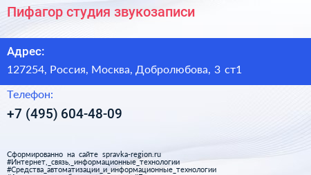 Пифагор, студия звукозаписи по адресу 127254, Россия, Москва, Добролюбова, 3 ст1 в дальнейшем Организация, размещена в следующих категориях: