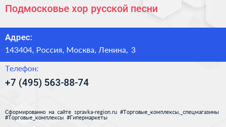 Подмосковье, хор русской песни по адресу 143404, Россия, Москва, Ленина, 3 в дальнейшем Организация, размещена в следующих категориях: