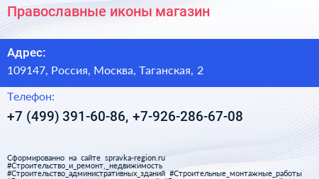 Православные иконы, магазин по адресу 109147, Россия, Москва, Таганская, 2 в дальнейшем Организация, размещена в следующих категориях: