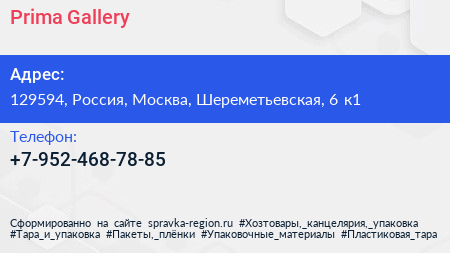 Prima Gallery по адресу 129594, Россия, Москва, Шереметьевская, 6 к1 в дальнейшем Организация, размещена в следующих категориях: