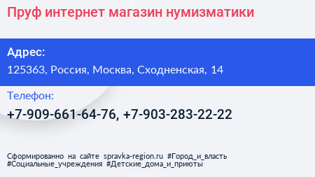 Пруф, интернет-магазин нумизматики по адресу 125363, Россия, Москва, Сходненская, 14 в дальнейшем Организация, размещена в следующих категориях:
