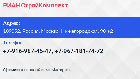 РИАН СтройКомплект по адресу 109052, Россия, Москва, Нижегородская, 90 к2 в дальнейшем Организация, размещена в следующих категориях: