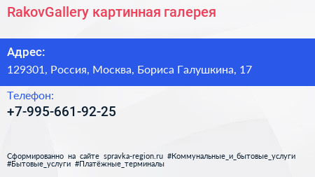 RakovGallery, картинная галерея по адресу 129301, Россия, Москва, Бориса Галушкина, 17 в дальнейшем Организация, размещена в следующих категориях: