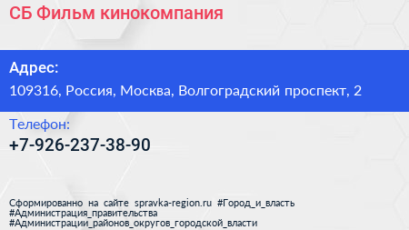 СБ Фильм, кинокомпания по адресу 109316, Россия, Москва, Волгоградский проспект, 2 в дальнейшем Организация, размещена в следующих категориях:
