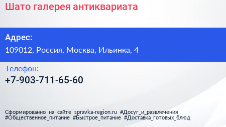 Шато, галерея антиквариата по адресу 109012, Россия, Москва, Ильинка, 4 в дальнейшем Организация, размещена в следующих категориях:
