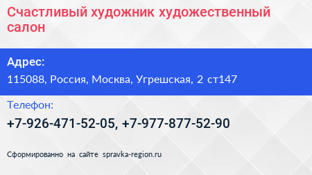 Счастливый художник, художественный салон по адресу 115088, Россия, Москва, Угрешская, 2 ст147 в дальнейшем Организация, размещена в следующих категориях: