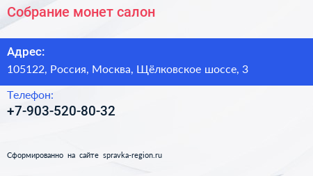 Собрание монет, салон по адресу 105122, Россия, Москва, Щёлковское шоссе, 3 в дальнейшем Организация, размещена в следующих категориях: