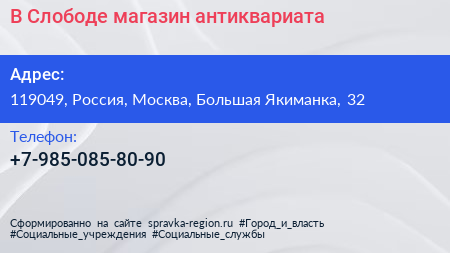 В Слободе, магазин антиквариата по адресу 119049, Россия, Москва, Большая Якиманка, 32 в дальнейшем Организация, размещена в следующих категориях: