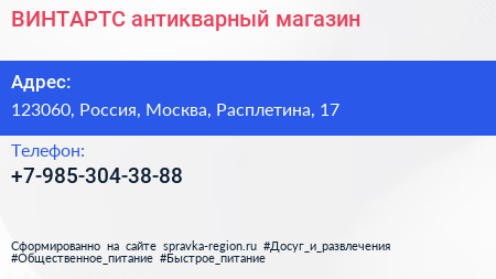 ВИНТАРТС, антикварный магазин по адресу 123060, Россия, Москва, Расплетина, 17 в дальнейшем Организация, размещена в следующих категориях: