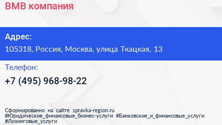 ВМВ, компания по адресу 105318, Россия, Москва, улица Ткацкая, 13 в дальнейшем Организация, размещена в следующих категориях: