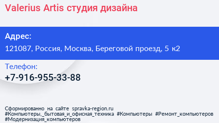 Valerius Artis, студия дизайна по адресу 121087, Россия, Москва, Береговой проезд, 5 к2 в дальнейшем Организация, размещена в следующих категориях: