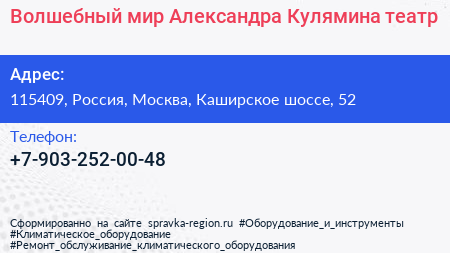 Волшебный мир Александра Кулямина, театр по адресу 115409, Россия, Москва, Каширское шоссе, 52 в дальнейшем Организация, размещена в следующих категориях: