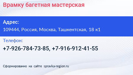 Врамку, багетная мастерская по адресу 109444, Россия, Москва, Ташкентская, 18 к1 в дальнейшем Организация, размещена в следующих категориях: