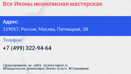 Все Иконы, иконописная мастерская по адресу 119017, Россия, Москва, Пятницкая, 28 в дальнейшем Организация, размещена в следующих категориях: