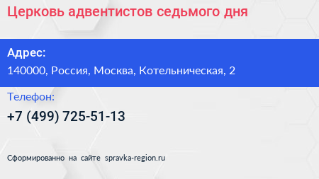 Церковь адвентистов седьмого дня по адресу 140000, Россия, Москва, Котельническая, 2 в дальнейшем Организация, размещена в следующих категориях: