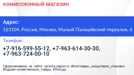 комиссионный магазин по адресу 123104, Россия, Москва, Малый Палашёвский переулок, 6 в дальнейшем Организация, размещена в следующих категориях: