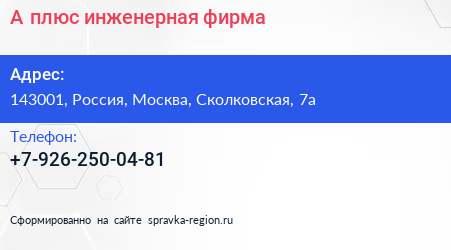 А-плюс, инженерная фирма по адресу 143001, Россия, Москва, Сколковская, 7а в дальнейшем Организация, размещена в следующих категориях: