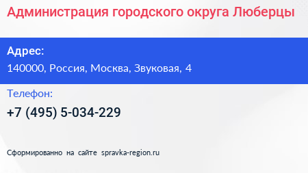 Администрация городского округа Люберцы по адресу 140000, Россия, Москва, Звуковая, 4 в дальнейшем Организация, размещена в следующих категориях: