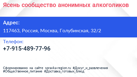 Ясень, сообщество анонимных алкоголиков по адресу 117463, Россия, Москва, Голубинская, 32/2 в дальнейшем Организация, размещена в следующих категориях: