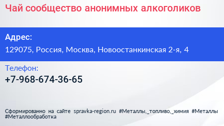 Чай, сообщество анонимных алкоголиков по адресу 129075, Россия, Москва, Новоостанкинская 2-я, 4 в дальнейшем Организация, размещена в следующих категориях: