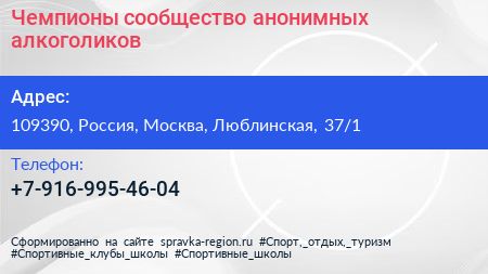 Чемпионы, сообщество анонимных алкоголиков по адресу 109390, Россия, Москва, Люблинская, 37/1 в дальнейшем Организация, размещена в следующих категориях: