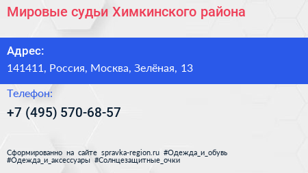 Мировые судьи Химкинского района по адресу 141411, Россия, Москва, Зелёная, 13 в дальнейшем Организация, размещена в следующих категориях:
