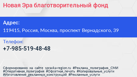 Новая Эра, благотворительный фонд по адресу 119415, Россия, Москва, проспект Вернадского, 39 в дальнейшем Организация, размещена в следующих категориях:
