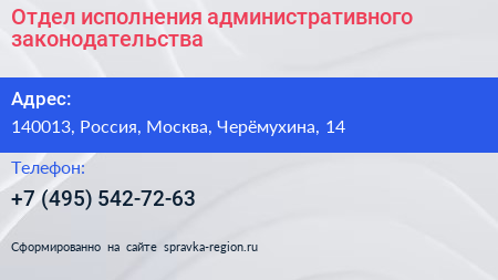 Отдел исполнения административного законодательства по адресу 140013, Россия, Москва, Черёмухина, 14 в дальнейшем Организация, размещена в следующих категориях: