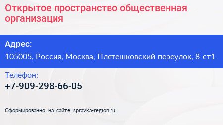 Открытое пространство, общественная организация по адресу 105005, Россия, Москва, Плетешковский переулок, 8 ст1 в дальнейшем Организация, размещена в следующих категориях: