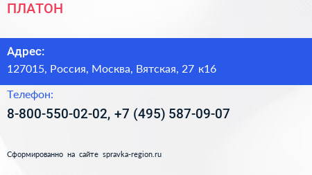 ПЛАТОН по адресу 127015, Россия, Москва, Вятская, 27 к16 в дальнейшем Организация, размещена в следующих категориях: