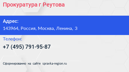 Прокуратура г. Реутова по адресу 143964, Россия, Москва, Ленина, 3 в дальнейшем Организация, размещена в следующих категориях: