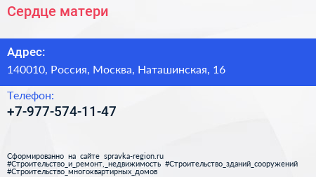 Сердце матери по адресу 140010, Россия, Москва, Наташинская, 16 в дальнейшем Организация, размещена в следующих категориях: