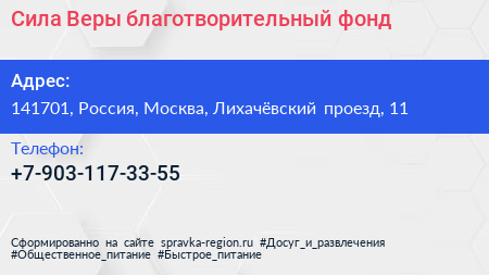 Сила Веры, благотворительный фонд по адресу 141701, Россия, Москва, Лихачёвский проезд, 11 в дальнейшем Организация, размещена в следующих категориях: