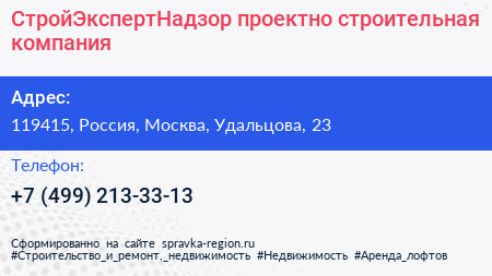 СтройЭкспертНадзор, проектно-строительная компания по адресу 119415, Россия, Москва, Удальцова, 23 в дальнейшем Организация, размещена в следующих категориях: