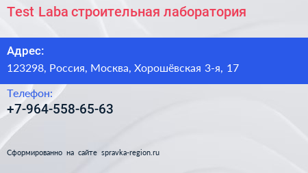Test-Laba, строительная лаборатория по адресу 123298, Россия, Москва, Хорошёвская 3-я, 17 в дальнейшем Организация, размещена в следующих категориях: